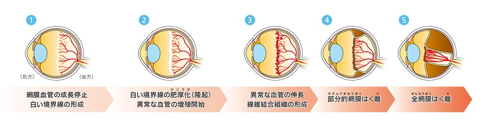 ※出生週数が極端に早いと、血管のある眼の後方部分も虚血状態となって、後方で異常な血管が増殖する場合もあります。
